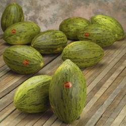 €2,00Zaaien: bij het bezit van een verwarmde kas, vanaf eind januari en uitplanten begin maart. Voor de koude kas: zaaien vanaf eind maart, uitplanten begin mei. Plantafstand 150×50 cm. De planten mogen kruipen of klimmen langs touw. Hoewel dit ras in verhouding vroeg is, is het type wel laatrijpend. Maar geen nood: na het oogsten rijpt de vrucht nog na. De vorm is ovaal en groengeel gemarmerd. De dikke vruchtschil zorgt voor de lange bewaarbaarheid. Het vruchtvlees is wit en zeer zoet! 25 zaden, 1 gram